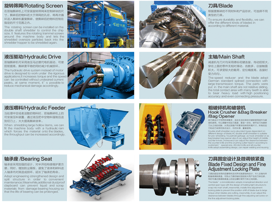 環(huán)創(chuàng)DS系列雙軸撕碎機(jī)可滿足各行業(yè)的廢料回收要求,適合撕碎較厚難碎的物料如:電子垃圾、硬質(zhì)塑料、金屬、木材、廢舊橡膠、包裝桶、托板等。可回收材料種類繁多,經(jīng)撕碎后的物料可直接回收或根據(jù)需求作進(jìn)一步細(xì)化處理。適用于工業(yè)廢棄物回收、醫(yī)療回收、電子制造、托板制造、木材加工、生活垃圾回收、塑料回收、輪胎回收、造紙等行業(yè)的應(yīng)用。該系列雙軸撕碎機(jī)擁有低速、大扭矩、低噪音等特點(diǎn),采用西門子編程系統(tǒng),可以自動(dòng)控制、設(shè)有啟動(dòng)、停止、反轉(zhuǎn)以及超載自動(dòng)反轉(zhuǎn)控制功能。